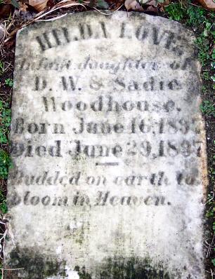 | Woodhouse, Hilda Love | June 16, 1897 | June 29, 1897 | Infant daughter of D. W. & Sadie Woodhouse |