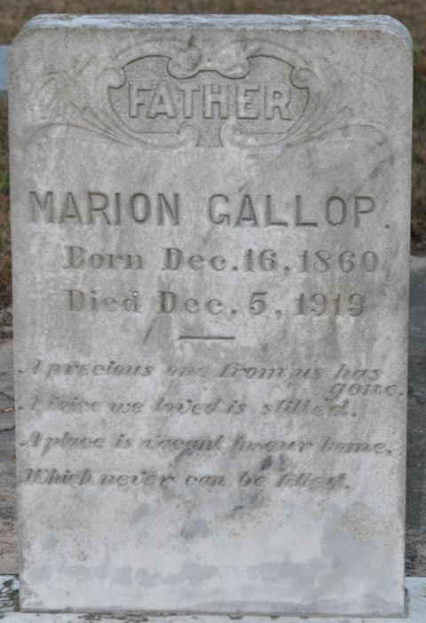 | Gallop, Marion | Dec. 16, 1860 | Dec. 5, 1919 | Father - A precious one from us has gone. A voice we loved is stilled. A place is vacant in our home. Which never can be filled. [see obituary] |