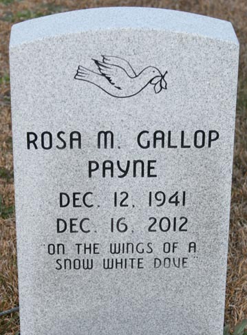 | Payne, Rosa M. Gallop | Dec. 12, 1941 | Dec. 16, 2012 | On the wings of a snow white dove [see obituary] |