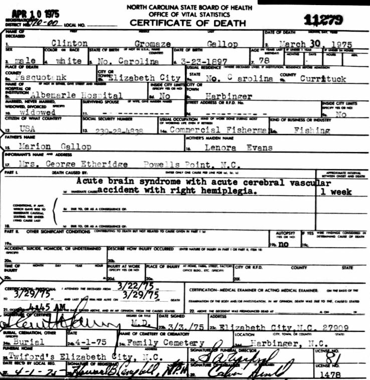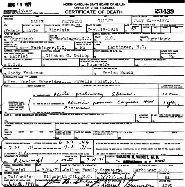 | Gallop, Mamie Fentress | Sept. 19, 1914 | July 21, 1971 | [see death certificate] |