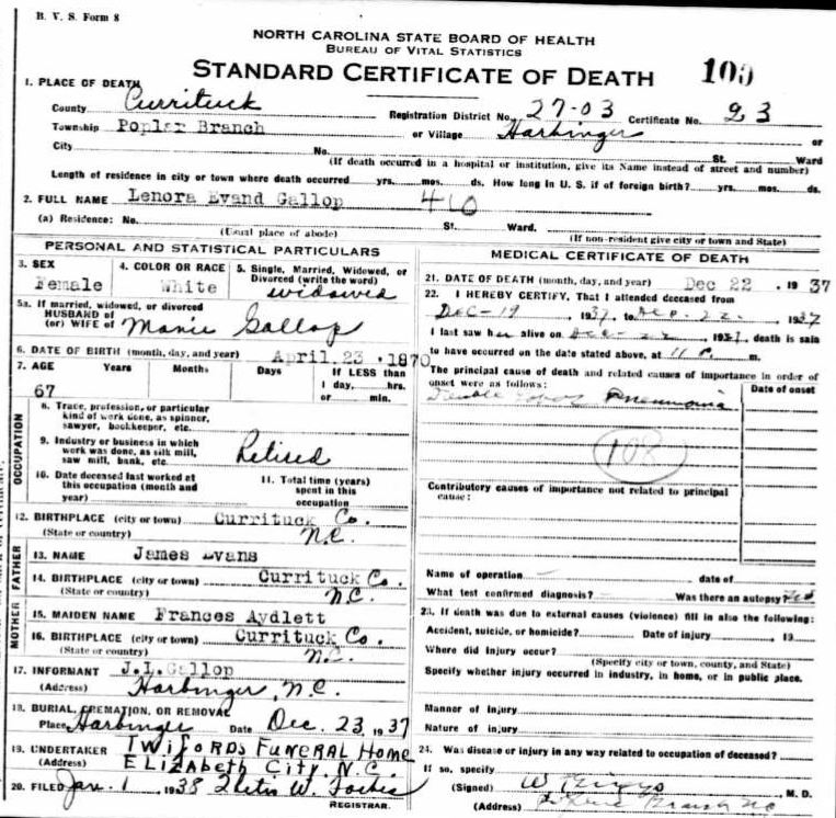 | Gallop, Lenora | April 23, 1870 | Dec. 22, 1937 | Mother - Rest mother, rest in quiet sleep, while friends in sorrow o'er thee weep. [see death certificate] |