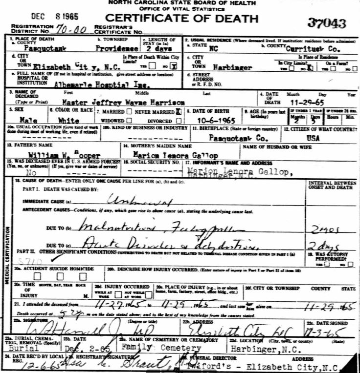 | unknown | [Possibly the grave marker for Jeffrey Wayne Harrison (Oct. 6, 1965 -Nov. 29, 1965) whose marker was evident in the earlier surveys. See his death certificate] |
