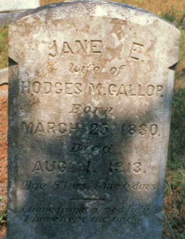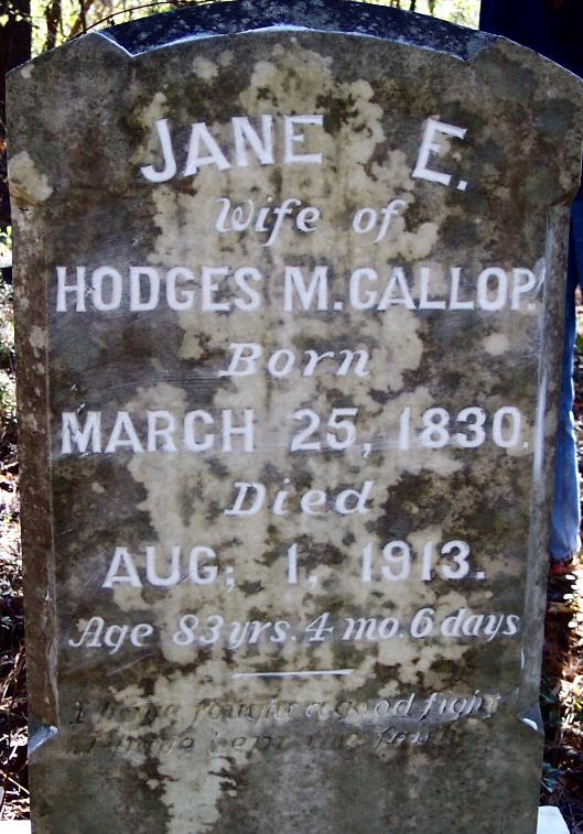 | Gallop, Jane E. | March 25, 1830 | Aug, 1, 1913 | Wife of Hodges M. Gallop; Age 83 yrs. 4 mo. 6 days [1989 photo] |