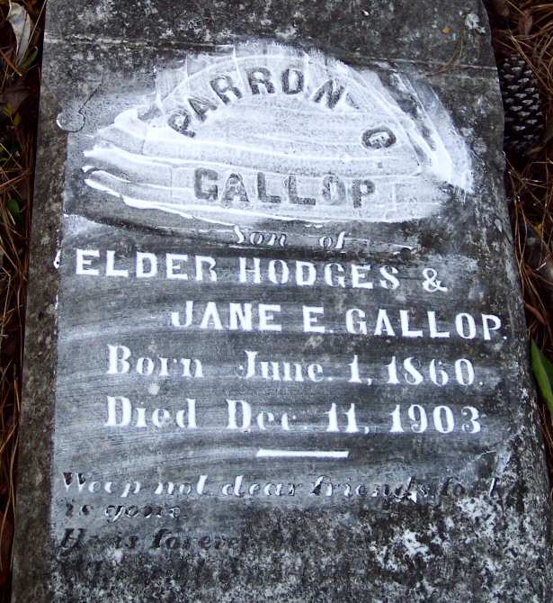 | Gallop, Parron G. | June 1, 1860 | Dec. 11 1903 | Son of Elder Hodges & Jane E. Gallop [Foot Marker] [1989 photo] |