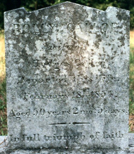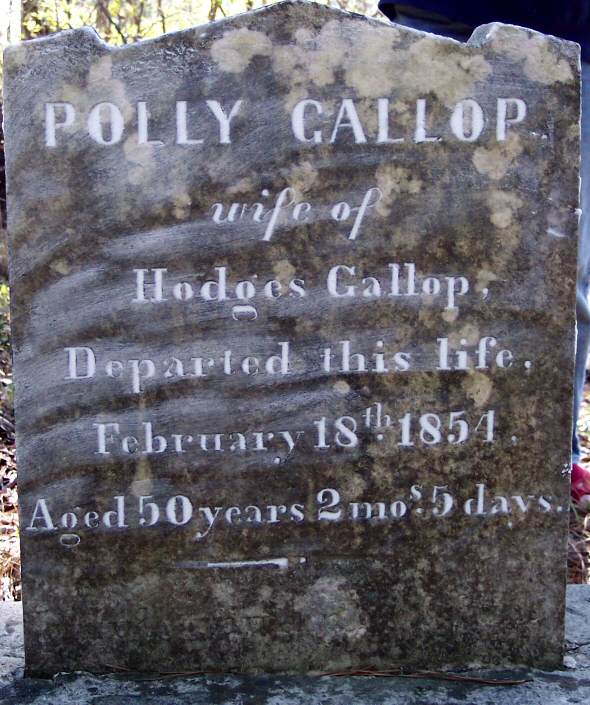 | Gallop, Polly | Feb. 18, 1854 | Wife of Hodges Gallop; Aged 50 years 2 mos 5 days [1989 photo] | |