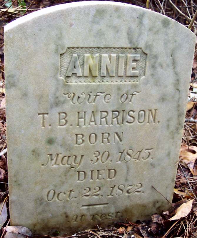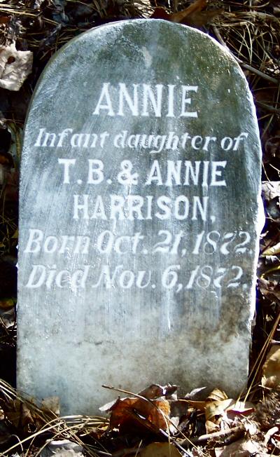 | Harrison, Annie | Oct. 21, 1872 | Nov. 6, 1872 | Infant Daughter of T. B. & Annie Harrison [see above note] |