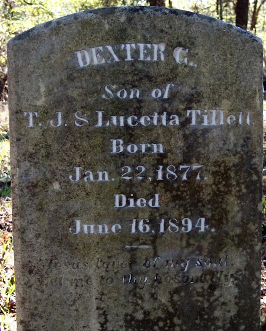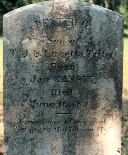 | Tillett, Dexter G. | Jan. 22, 1877 | June 16, 1894 | Son of T. J. & Lucetta Tillett [1989 photo] |