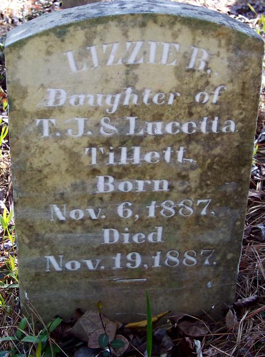 | Tillett, Lizzie B. | Nov. 6, 1887 | Nov. 19, 1887 | Daughter of T. J. & Lucetta Tillett |