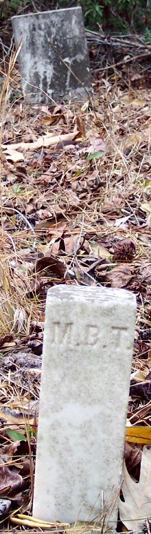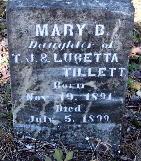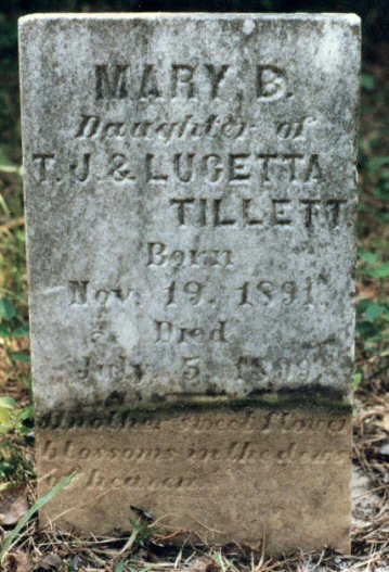 | Tillett, Mary B. | Nov. 19, 1891 | July 5, 1899 | Daughter of T. J. & Lucetta Tillett [Foot Marker] [1989 photo] |