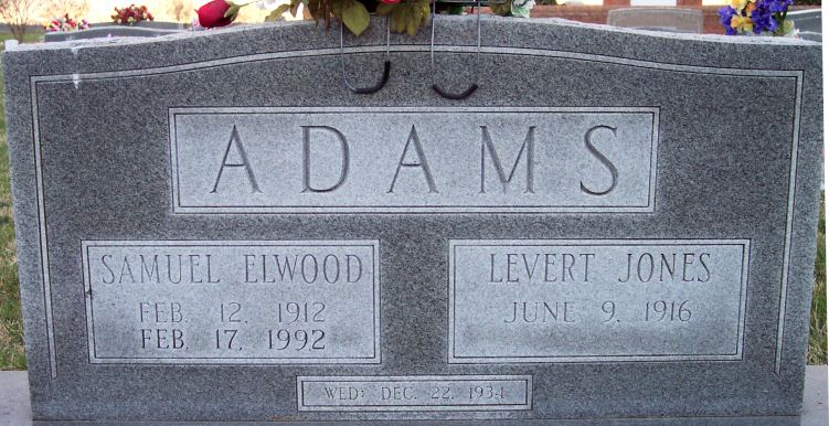 | Adams, Samuel Elwood | Feb. 12, 1912 | Feb. 17, 1992 | [Double with: Levert Jones Adams] Wed: Dec. 22, 1934 |