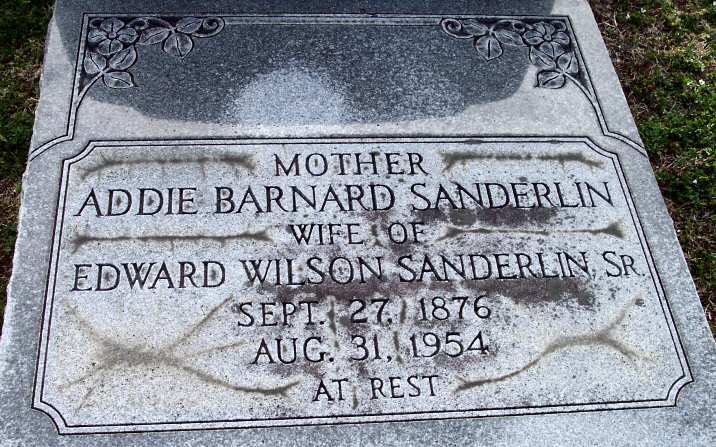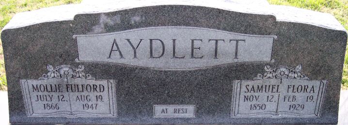 | Aydlett, Mollie Fulford | July 12, 1866 | Aug. 19, 1947 | [Double with: Samuel Flora Aydlett] |