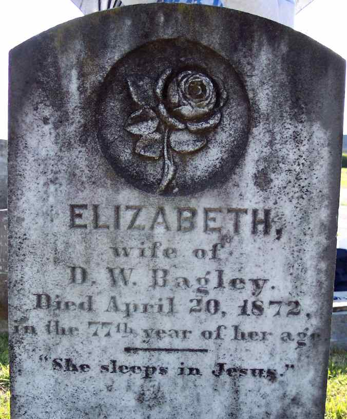 | Bagley, Elizabeth | [c1795] | April 20, 1872 | Wife of D.W. Bagley - In the 77th year of her age |