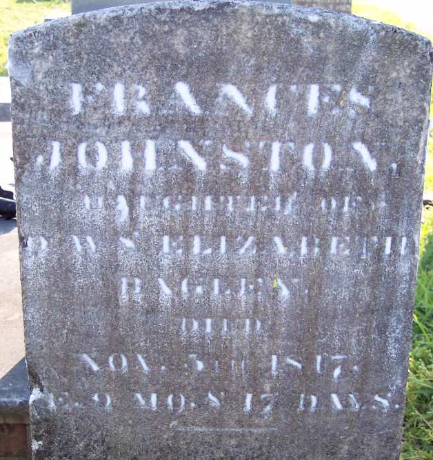 | Bagley, Frances Johnston | Nov. 5, 1847 | Daughter of D.W. & Elizabeth Bagley - Age 9 mo. & 17 days | |