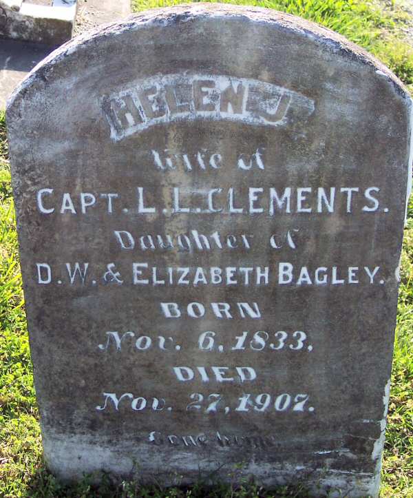 | Bagley, Helen J. | Nov. 6, 1833 | Nov. 27, 1907 | Wife of Capt. L.L. Clements - Daughter of D.W. & Elizabeth Bagley |