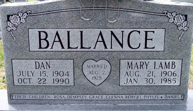with: Mary Lamb Ballance] Married: Aug. 2, 1928 Their children: Rosa, Dempsey, Grace, Glenna, Robert, Phylis & Daniel |