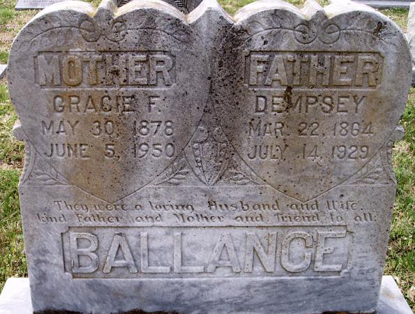 | Ballance, Dempsey | Mar. 22, 1864 | July 14, 1929 | [Double with: Gracie F. Ballance] Father |