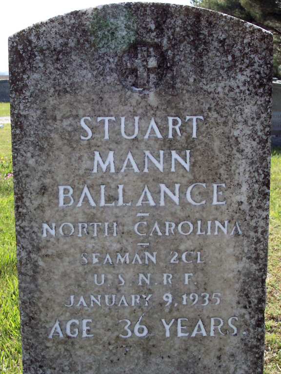 | Ballance, Stuart Mann | [Nov. 8, 1898] | Jan. 9, 1935 | North Carolina Seaman 2CL USN RF - Age 36 Years [Death Certificate] |