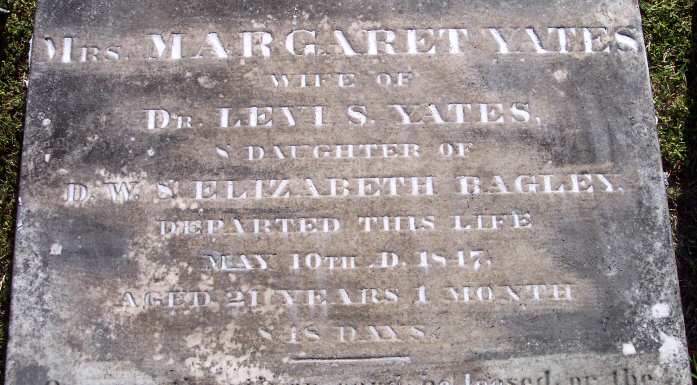 | Yates, Margaret Bagley | [c1826] | May 10, 1847 | Wife of Dr. Levi S. Yates - Daughter of D.W. & Elizabeth Bagley - Aged 21 Years 1 Month & 18 Days |