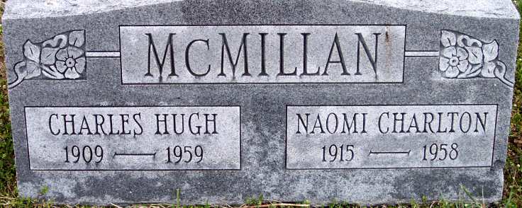 | McMillan, Naomi Charlton | [Apr. 2] 1915 | [Sept. 8] 1958 | [Double: Charles Hugh McMillan] [Death Certificate] |