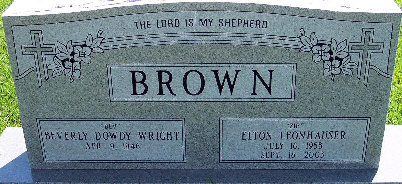 | Brown, Elton "Zip" Leonhauser | July 16, 1953 | Sep. 16, 2003 | [Double with: Beverly Dowdy Wright Brown] |