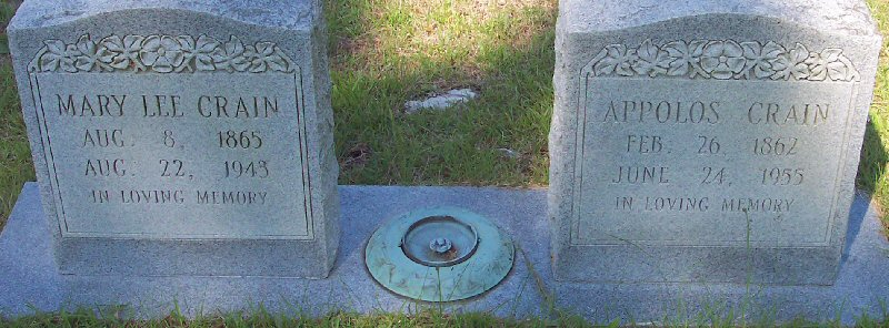 | Crain, Appolos | Feb. 26, 1862 | June 24, 1955 | [Double with: Mary Lee Crain] - [close-up] |