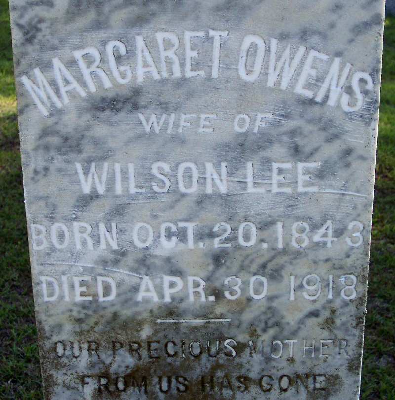 | Owens, Margaret | Oct. 20, 1843 | Apr. 30, 1918 | Wife of Wilson Lee - Mother of Daniel Lee - [close-up] |