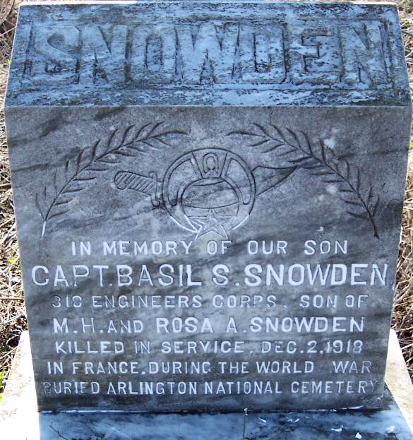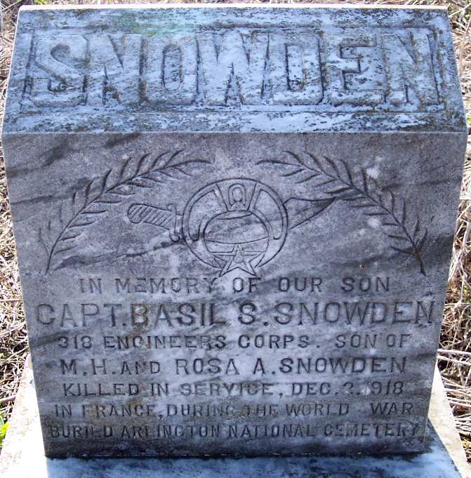 Emblem [Enhanced] 318 Engineers Corps; Son of M.H. & Rosa A. Snowden; Killed in service Dec. 2, 1918 in France during the World War. Buried Arlington National Cemetery. |