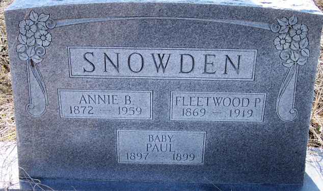 | Snowden, Annie B. | [Mar. 16] 1872 | [Mar. 16] 1959 | [Triple with: Fleetwood P. Snowden & baby Paul Snowden] [Death Certificate] |