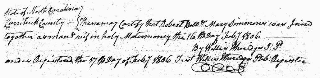 [Deed Book 9; pg. 405-406] Nov. 28, 1807 - I Caleb ETHERIDGE Sheriff by a Writ of Firi Facias issued out of the Court of Pleas & Quarter Sessions ordering me out of the goods, chattles, & lands of David TATUM I was to cause the sum of £23, 10 Shillings which was recovered against him by William ETHERIDGE. In obedience of Wirt I took into possession a tract of land whereon Thomas BAXTER then lived on the Currituck Shore only the Right of David TATUM. Binding on Spence HALLs land on the North by Jollif HOLSTEADs & Jeremiah PERKINS land, South the land of Robert BELL & Elizabeth WARDs orphan of Charles WARD dec’d, on East by the Sound, it being the land claimed by David TATUM & held by Gideon MARCHANT. After legal notice the land was offered for sale on Nov. 28, 1807 where & when Joseph BALLENTINE bid the sum of £2 & 10 Shillings which is 6 Pence per acre which was highest bid, by virtue of Writ I Caleb ETHERIDGE Sheriff have granted unto Joseph BALLENTINE the Right & Claim to said land. Witness: T. BAXTER; Registered July 14, 1808