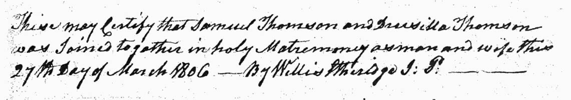 [Deed Book 9; pg. 379-380] Jan. 28, 1808 - We Abel ROBERTS & Mary his Wife for the Natural Love & Effection which we hath & bequeath unto my Son Thomas ROBERTS the following: 1 cow & calf, 1 bed & furniture & all the remainder of the property that I now possess. Witness: Will. BRUMSEY, Dory DAUGE; Registered April 23, 1808