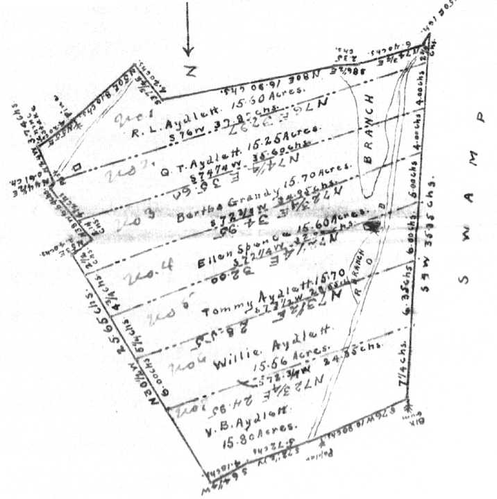 16 Sept 1909 - Q.T. AYDLETT, R.L. AYDLETT, Ellen SPENCE & husband J.F. SPENCE, and V.B. AYDLETT, plaintiffs, vs. Bertha GRANDY and husband Mark, Willie AYDLETT and Tommie AYDLETT, defendants (Petition for partition); plaintiffs state that they are tenants in common and are in possession of the following described lands lying in Poplar Branch Twp., excepting the dower of Georganna AYDLETT, widow of the late John AYDLETT. On the north by the land of the heirs of Jesse SANDERSON, deceased. On the East by the lands of W.B. GARRINGTON, W.B. JONES, Isaac O'NEAL and Annie W. OWENS. On the South by the lands of the heirs of Jesse SANDERSON, deceased, the lands of the heirs of Jonathan CASE, deceased, and the lands of Abner JARVIS. On the West by the lands of Ella GILDEN and Annie W. OWENS. The interest of each petitioner is 1/7 each; that Bertha GRANDY, Willie AYDLETT and Tommie AYDLETT are minors without any guardian; that each of the minors is over 14 years; that said petitioners and defendants heired said tract of land from their father, John AYDLETT, now deceased; that petitioners desire to hold their land in severalty. Petitioners ask that commissioners be appointed to divide the said land into seven equal shares and allot to each of the petitioners such shares.