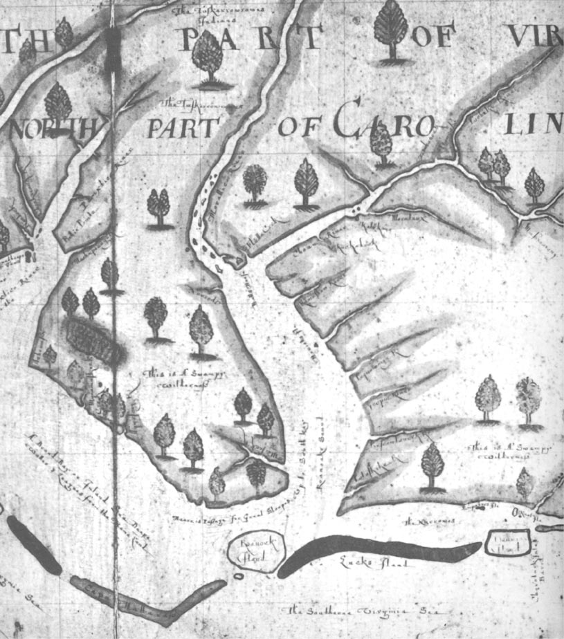 For over a half century after the failure of the Roanoke Island colony the Carolina coast was but little troubled by the activities of the European colonizing powers. Searches for the remnants of the Lost Colony by the English at Jamestown, made under specific orders from England, were unsuccessful. Reports have survived of sporadic attempts to settle land in the region around Albemarle Sound in the first half of the 17th century, but the undertakings were apparently not permanent. Around 1650, however, English settlers in Virginia began to show increasing interest in the ill-defined area to the south of the James River in Virginia. Purchase of land from the Indians and grants for settlement by the General Assembly of Virginia along the Roanoke, Chowan, and other rivers flowing into the sound were recorded in the years shortly prior to the granting of the Carolina Charter in 1663 to the Lords Proprietors. The Comberford map is concrete evidence of the interest in the area which was developing. The provenance or source of information on the Comberford map is not known, but the topography is more accurate and detailed than in any previous map of the southeast coast from such a large area. Many English names which survive in present-day nomenclature are found here for the first time. "Luck's Iland" on the coast is the only extant identification of this Banks Island, which was referred to in the 1663 Charter to the Lords Proprietors as the northern limit of this grant at 361/2 degrees north latitude. The inlets which made Lucks Island have since disappeared.