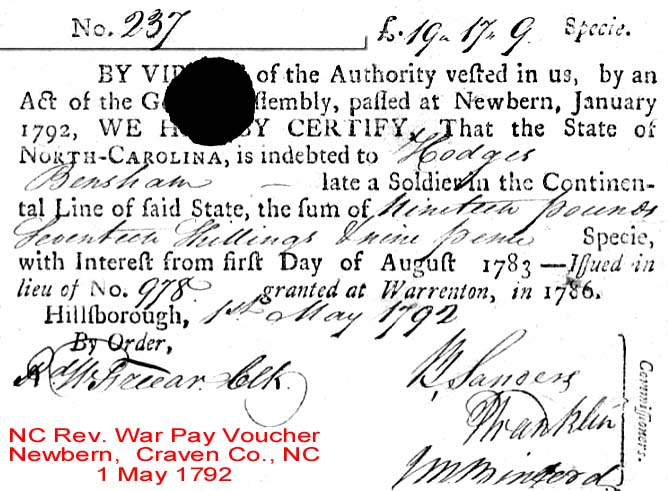 [4] NC State Records, Clark, Vol. XVI, 1782-1783, p. 97: Sgt. Hodges Bencham, Company: Tartarson's, Dates of Enlistment & commission: '77, Period of Service: 3 year, Occurrences: Dead 30 March '78.