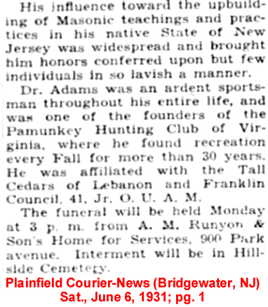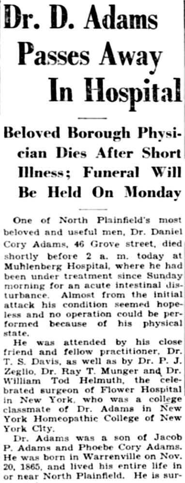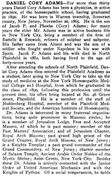 16 May 1923 | Source: The History of Union Co., New Jersey by Abraham Van Doren Honeyman [see part 1 & part 2 of a bio on Daniel C. Adams] [see obituary part 1; part 2 & part 3] |