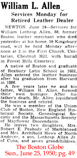 | William L. [Lothrop] Allen | 30 Jan 1912 | William Lothrop Allen, son of William Henry Allen (1836-1903) & Adeline Amanda Smith (1837-1911) was born in Boston on Apr. 2, 1862 and died June 24, 1950 [see obituary]. In 1877 he entered the Roxbury Latin School where he prepared for college, graduating in June 1882, and that fall he entered Harvard with the Class of 1886. He was a classmate of Francis B. Austin & William Henry Slocum, two names on this list of members at the Narrows Island Club. He married Margaret Converse in MA on Nov. 7, 1888. By 1900 they had 4 children and 5 servants and lived on Kingsbury St. and was listed as a leather merchant. His father died in November 1903. In 1910 he had his "own income" and in 1920 he was listed as a Newton City Alderman. Adeline Allen continued to live at her 291 Commonwealth home until her death in June of 1911. In her will, she left 291 Commonwealth to William Lothrop Allen, who continued to be a hide and leather dealer until 1908, when he retired. William and Margaret (Converse) Allen lived in Chestnut Hill. He leased 291 Commonwealth to others. In 1915, William and Margaret Allen made 291 Commonwealth their Boston home. Their son, William Lothrop Allen, Jr., lived with them. He had graduated from Harvard in 1914. The Allen's primary residence remained Chestnut Hill. On February 24, 1933, 291 Chestnut was acquired from William L. Allen by the Massachusetts Hospital Life Insurance Company. |