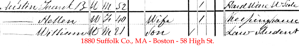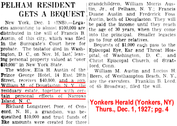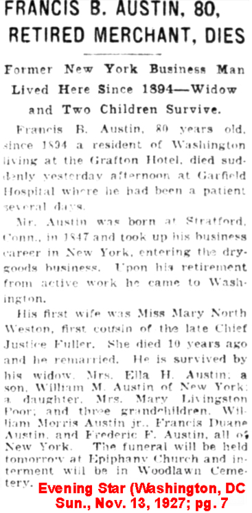 | Francis B. [Baynes] Austin | 3 Jan 1899 | Francis B. Austin was born in Stratford, Connecticut in June 1847 & died in Washington, DC on Nov. 12, 1927 [see obituary and estate division] from acute colitis and an abcessed gall bladder. He married 1st Mary North Weston (1851 - circa 1917) circa 1874 and they lived in NY but then moved to New Jersey by 1910. He married 2nd Ella H. McLean in Manhattan, NY on Sept. 20, 1920. They are buried in Woodlawn Cemetery. |