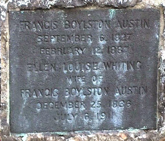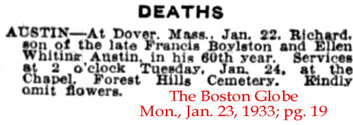 | Richard [Edward] Austin | 19 May 1911 | Francis Boylston Austin, Sr. (1827-1887) and Ellen Louise Whiting (1836-1911) who married in Charleston, MA on Feb. 17, 1857., were the parents of Richard Edward Austin and the two men listed below him on this list. Francis & Ellen are buried in Forest Hills Cemetery in Jamaica Plain, MA [see tombstone marker]. In 1860 and 1870 they lived in Charleston, MA but by 1880 they had moved to Boston. [see image 1 & image 2] Richard was born May 6, 1873 & died Jan. 22, 1933. [see obituary & trustees of Austin estates] His brother, James Walker Austin, had died just 2 months earlier. Richard, James & William are on a tombstone plaque together. |