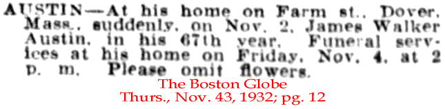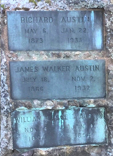 | James W. [Walker] Austin | 19 May 1911 | James Walker Austin was the son of Francis Boylston Austin, Sr. and brother of Richard, William Russell, and Frank B. Austin, Jr. James was born July 16, 1866 and died Nov. 2, 1932 [see obituary & trustees of Austin estates] He is buried in Forest Hills Cemetery in Jamaica Plain, MA [see tombstone marker] |