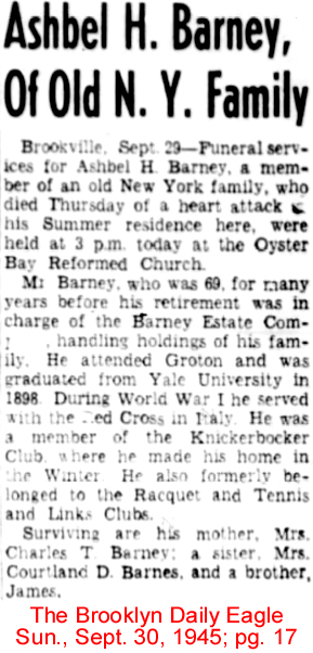 | Ashbel Hinman Barney | 5 Jul 1900 | Ashbel, son of Charles Tracy Barney, was born July 29, 1876 & died Sept. 27, 1945; never married; buried Brookville Cemetery, Nassau Co., NY [see photo from Yale 1898] [see obituary] |