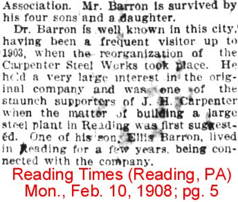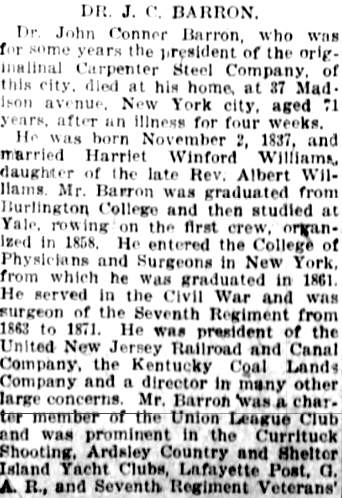 | Dr. J.C. [John Conner] Barron | 30 Apr 1885 | John was born Nov. 2, 1837 in Woodbridge, NJ & died in Woodbridge on Feb. 6, 1908. He married Harriett M. Williams on June 23, 1869. He is buried in First Presbyterian Churchyard in Woodbridge. Of note is Dr. Barron's sister, Maria (1839 - 1918), who married Charles DeForest Fredericks (1823 - 1894), photographic - daguerrotype and carte de visites pioneer with establishments in Paris, Havana, NYC, and Brooklyn. Dr. Barron probably joined at Narrows Island Club on Apr. 30, 1885. On Oct. 2, 1878, he bought Deed 4, Room 16, at the Currituck Shooting Club, which was not sold again until 6 Oct 1914 when William Woodward bought it. Either Dr. Barron's heirs/estate kept his dues paid from his death in 1908, or it reverted back to the club till 1914. In 1880, he was Secretary/Treasurer of the Currituck Shooting Club. On May 12, 1885, he bought Deed 8, Room 20, at the Currituck Shooting Club, and he sold it on Nov. 16, 1885. On Apr. 16, 1887, he bought Deed 6, Room 18, at the Currituck Shooting Club, and he sold it on Apr. 6, 1891. [see obit part 1 and part 2] [see Find-A-Grave for more information and portrait] |