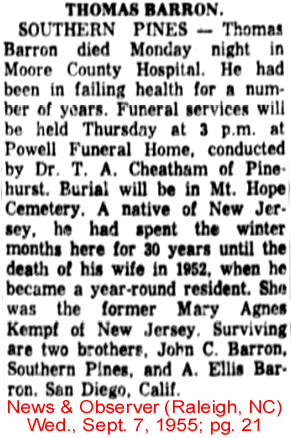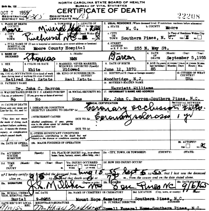 | Thomas C. Barron | 7 Nov 1894 | Thomas Barron, son of Dr. John Conner Barron, was only 24 years old when he qualified for membership in this club. He was born June 12, 1870 in Woodbridge, NJ & died Sept. 5, 1955 in Pinehurst, NC. He was married in 1909 1st to Elizabeth McCourt (1873-1933); 2nd in 1936 to Mary Agnes Kempf (1886-1952) and is buried in Mount Hope Cemetery in Southern Pines, NC. [see obituary & death certificate] |