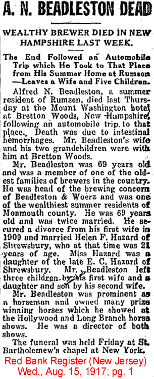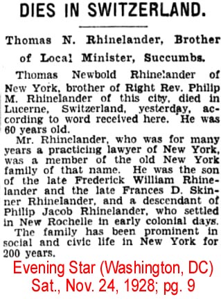 | Thomas N. [Newbold] Rhinelander | 27 Sep1921 | Thomas N. Rhinelander was born in Newport, RI on Aug. 29, 1865 & died in Lucerne, Switzerland on Nov. 23, 1928. He is buried in Island Cemetery in Newport, RI. [see obituary] Thomas was a 1st cousin to Herman LeRoy Edgar (elsewhere on this list). Herman's mother was Eliza Lucille Rhinelander (1832 - 1916), and she was a sister of Thomas Rhinelander's father, Frederic William Rhinelander (1828 - 1904). |