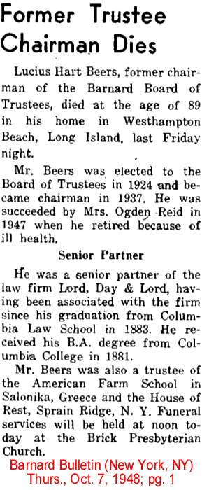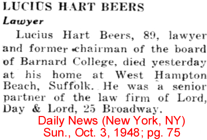 | Lucius H. [Hart] Beers | 6 Jan 1908 | The Henry Allen Moe papers show that Lucius was a law partner of Henry DeForest Baldwin, speed boat driver, fisherman, duck hunter (who at 80 still got his full bag of ducks with his old ten-gauge gun); Chairman of Board of Trustees, Barnard College; Trustee of the American Farm School, Salonika, Greece; member Anti-Submarine Board during WWI. His coming over from Narrows Island to Currituck Shooting was part of the club merger, apparently completed by 1940. The Narrows Island Club Membership Book is for 1923, so we don't know what happened there between 1923 and 1940. Lucius received Deed 15, Room 8, Currituck Shooting Club on Nov. 1, 1939. [see Find-A-Grave for photo and more information] [see obituary1 and] obituary 2] |