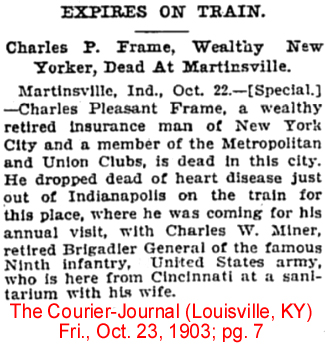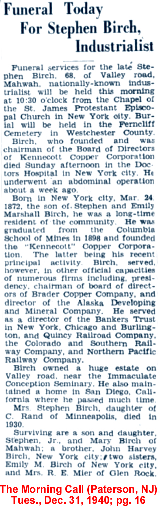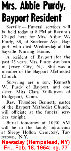| Charles R. [Robert] Purdy | 21 July 1883 | Charles Robert Purdy was born Aug. 15, 1859 in Westchester Co., NY and died Jan.29, 1922 at Bayport, Long Island, NY [see short obituary and a photo of Edgemere, his 29-acre estate]. He married Abbie Wilkinson on Nov. 2, 1888 at First Presbyterian Church in Bergen, NJ. Abbie was born in 1866 & died in 1954 [see obituary]. He is buried at Sleepy Hollow Cemetery in Westchester Co., NY |