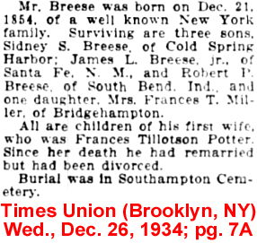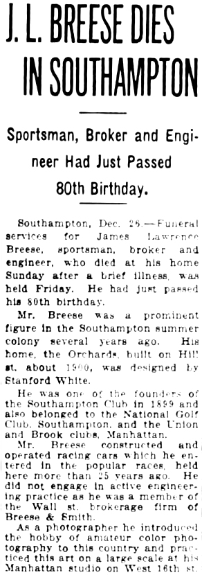 31 Aug 1892 | When James Lawrence Breese was born on December 24, 1854, in Manhattan, New York, his father, Josiah Salisbury Breese, was 42 and his mother, Augusta Eloise Lawrence, was 25. He married Frances Tileston Potter on September 8, 1880, in Newport, Rhode Island. They were the parents of at least 3 sons and 1 daughter. He lived in Harford, Maryland in 1910 and Manhattan, NY in 1920. He died on December 22, 1934 [see obit part 1 and obit part 2], in Southampton, Suffolk Co., New York, at the age of 79, and was buried in Southampton Cemetery in Southampton, NY. James was a wealthy stockbroker and renowned amateur photographer with a spectacular country home in Southampton called The Orchard. Built from 1895 to 1906, it was designed by McKim, Mead & White with Mount Vernon as the model for the main section. In 1916 Country Life listed it as one of "The Best Twelve Country Houses in America". Supported by a fortune made in finance at his firm Breese & Smith, his real passions were photography, art, automobiles, racing and architecture. |