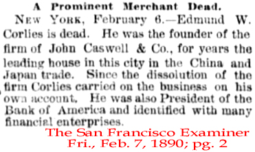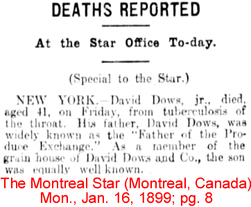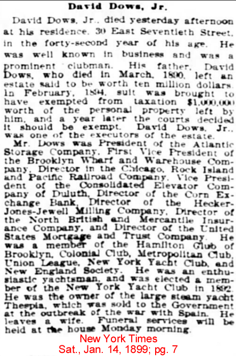 | David Dows, Jr. | 16 May 1890 | David Dows, Jr. was the son of David Dows, Sr. [1814-1890] & Margaret Esther Worcester [1831-1909]. He was born Sept. 7, 1857 in New York City & died in Manhattan, NY on Jan. 13, 1899. He married Jane Strahan who was born in Glasgow, Scotland. David & Jane are buried in Sleepy Hollow Cemetery in Westchester o., NY. [see bio of David Sr.] [see obituary for David Dows, Jr.; obituary 2 & obituary 3; obituary 4] |