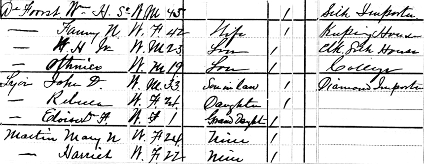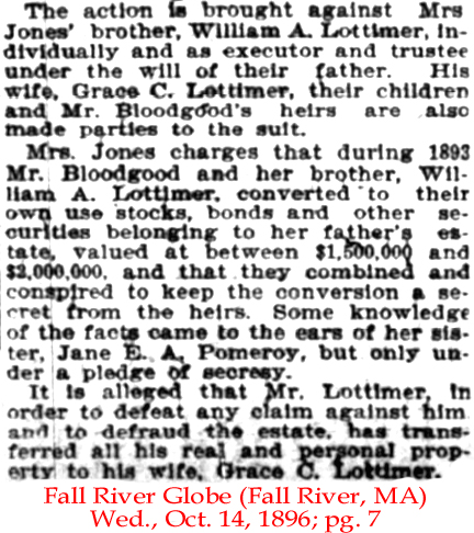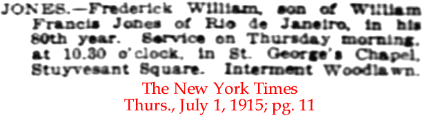 | Fred [Frederick] Jones | 21 July 1883 | *** This could be Frederick William Jones, born June 3, 1836 to William Francis Jones. Frederick died June 29, 1915 [see obituary] in Manhattan and is buried in Woodlawn Cemetery. He married Eliza Gardiner Lottimer (1844-1908) on Jan.6, 1865. Eliza was a daughter of William Lottimer who died with a massive estate in 1876. [see estate 1; estate 2 and estate 3] |