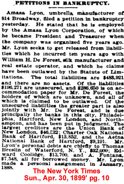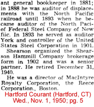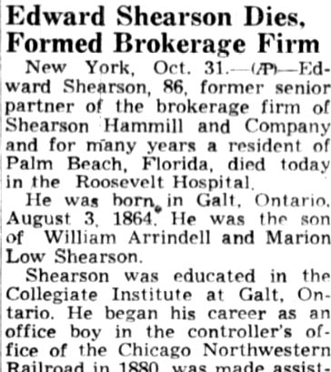 | Edward Shearson | 5 Apr 1909 | Edward was born in Galt, Ontario, Canada on Aug, 3,1864 & died in Hartford, CT on Oct. 31, 1950 [see obituary part 1 - part 2] |