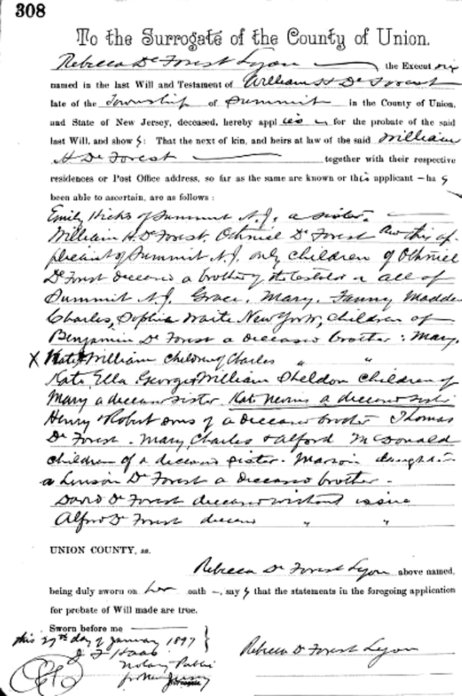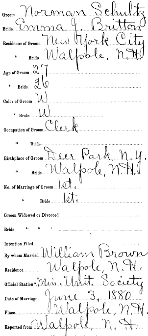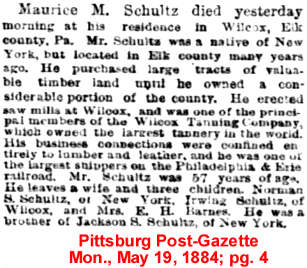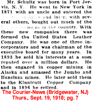 | Norman Schultz | 29 Nov 1899 | Norman Schultz, son of Maurice Morgan Schultz (1827-1884 [see obituary]) and Mary Ann Atherton (1826-1887), was born in Feb. 1854 in NY & died Aug. 21, 1918 in Summit, NJ [see obituary]. He married Emma Jane Britton (1852-1936) in Walpole, NH on June 3, 1880. They are buried in Fair Mount Cemetery in Chatham, NJ. Norman's father made his will in Elk Co., PA on March 21, 1884 leaving everything to be divided equally between his wife Mary Ann, his daughter Laura, and his two sons Norman & Irving. The Summit Bank of Summit, Union Co., NJ was organized in 1891 and Norman was listed as one of the Board of Directors. He was listed as a Capitalist in the 1905 Union Co., NJ census. In 1905 he owned part of the Bonanza Copper mines, said to be the largest property in Alaska. Norman's will was probated in Summit, Union Co., NJ [see image 1 and image 2] |