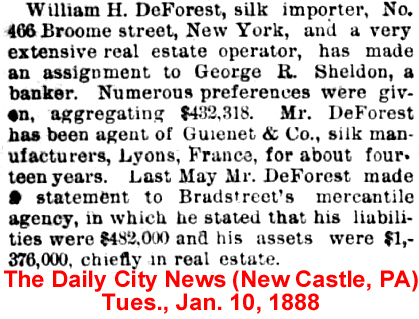 | William J. [Jarvis] Boardman | 5 Oct 1897 | William Jarvis Boardman, son of Henry Mason Boardman & Sarah Hall Benham, was born in Ohio on Apr. 15, 1832 and died in Washington, DC on Aug. 2, 1915 [see obituary]. He married Florence Sheffield (1840-1928) on Dec. 20, 1859 in New Haven, CT. In the 1900 Washington, DC census William was listed as a lawyer at 1801 P. Street, with 4 servants. They were still at the same address in 1910 and he was listed with his "own income" with 6 servants in their home. William was an attorney for the Valley Railroad Co. and held real estate in Cleveland, OH, New Haven, CT and Chattanooga, TN. Joseph Earl Sheffield listed his daughter, Florence Sheffield Boardman, in his 1875 will. William & Florence Boardman are buried in Rock Creek Cemetery in Washington, DC. |